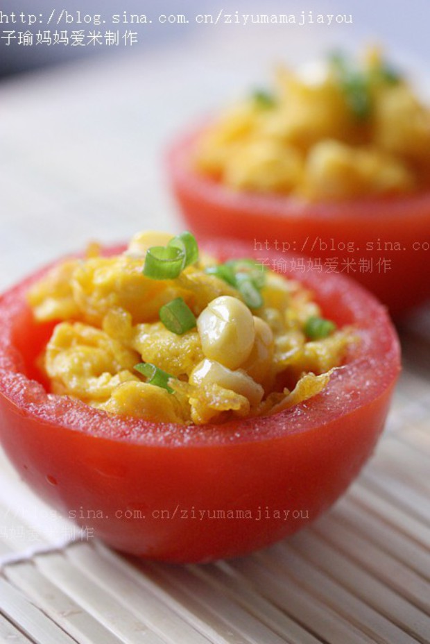 锅烧热,锅中放油,油冒轻烟后倒入蛋液,用筷子迅速划散,看到没有液体了迅速关火,将熟玉米倒入,拌匀,(如果之前鸡蛋中没放盐,这时候放也可以的)然后用勺子将玉米鸡蛋兜到番茄小碗中,最后撒上一点点葱绿装饰下,就可以了.趁热吃,小朋友建议吃1个鸡蛋的量就可以了