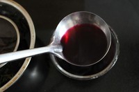 等苋菜的颜色变成绿色,汤汁变成紫红色即可捞出,一盆放入凉水放菜,另一碗里要用小漏勺过滤。