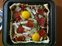 5. 面饼平铺烤盘上,第二步的酱汁均匀铺在上面,并铺好第四步的各种材料,最后上面磕入一个或者2个鸡蛋