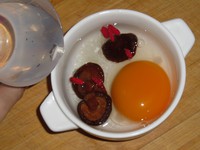 将鹅蛋打入碗中,放入几朵泡发的香菇、适量的枸杞子和冰糖末