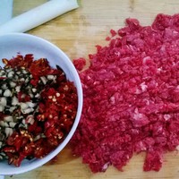 2. 香菇、牛肉、干红椒切黄豆大小粒