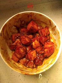 带皮五花肉切成小方块,加入耗油,生抽,老抽,少许盐。