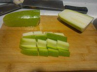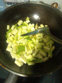 3. 西葫芦段入之前煎炒虾皮的油锅翻炒,注意不要过火,断生发软即可,放少许食盐和鸡精,翻炒后出锅。