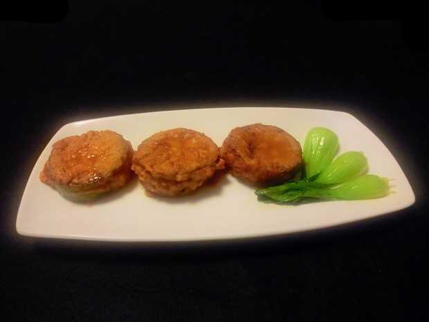 将西葫芦洗净,切片——两片之间不切断。将肉馅夹在中间,裹上面粉后再沾满打散好的蛋液下油锅煎至两面金黄