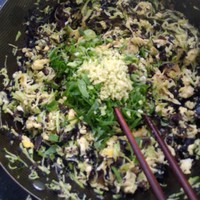 空干水分的木耳切碎,热锅凉油炒鸡蛋后,放入木耳翻炒。