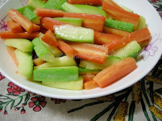 1. 西葫芦、胡萝卜都切成4-5公分左右的长条,西葫芦皮可以不削去,这样能增加西葫芦的脆度