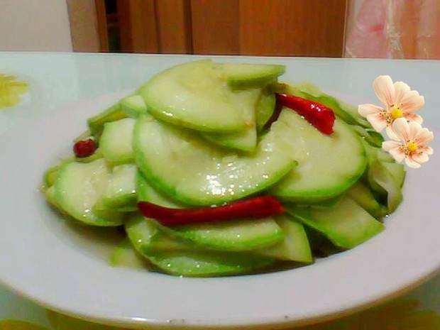 3. 锅烧热放入少许的色拉油放入蒜片干辣椒丝炒香再倒入焯过好的西葫芦翻炒,下入材料一勺糖两大勺醋继续翻炒【炒制时间不要太久】