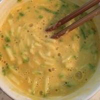 1. 嫩嫩的西葫芦,切成细细的丝,再从中间切断,放入碗里,磕进去两颗鸡蛋,搅拌均匀,再放入适量面粉,拌匀,放置片刻,让西葫芦里的水分充分跑出来