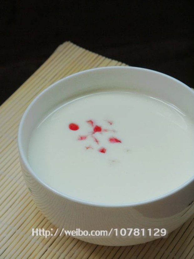 吃不了生姜,也就一直没尝试过简单的姜撞奶,今天肚子不舒服喝红糖水也不管用了,又不想吃东西,试着做了姜撞奶,凝固后奶还是温的,姜味儿和奶甜味混着还挺对味儿,跟布丁似的,吃的胃里暖暖的。加了几滴草莓果酱,起个好听的名字:踏雪寻梅---姜撞奶