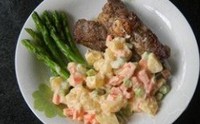 将土豆丁、胡萝卜丁和芦笋丁混合倒入一个碗中,加入色拉酱搅拌匀待用