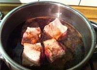 猪皮向下,倒入很多料酒(我倒了150~230ml),再加一点温水,不要没过肉。大火烧沸,转至最小火,盖闷两个小时,快结束时可以尝尝味道,什么不够加什么。