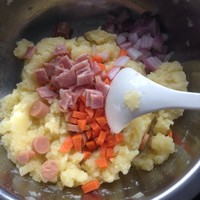 把自己喜欢的配料与土豆泥混合(我放了洋葱、胡萝卜、火腿肠、培根,按照家人需要来放)
