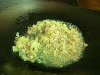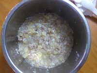 猪肉、冬菇剁末搅拌,土豆切粒先煲软,米洗干净备用。