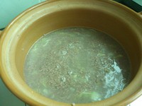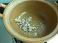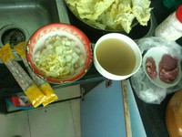 准备食材:猪肉切片、娃娃菜切碎、冬瓜切丁、高汤一碗、面粒两包。