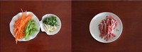 胡萝卜洗净去皮切丝,尖椒洗净去籽切丝,大蒜切片,然后加入1小勺老抽、3克的盐、适量的淀粉和1勺水抓匀腌制15分钟