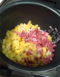 3. 把大米、咸肉丁、炒好的土豆丁倒在电饭煲中,正常做米饭加水量,开启米饭程序,就等着吃吧~