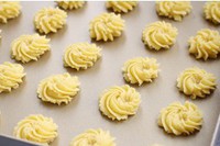 装入裱花袋,花嘴垂直于烤盘,均匀绕圈挤出,收尾往中间轻戳一下,提起。