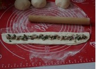 取一个面剂,擀成0.2cm左右厚的长条,排入1/4的香葱肉馅