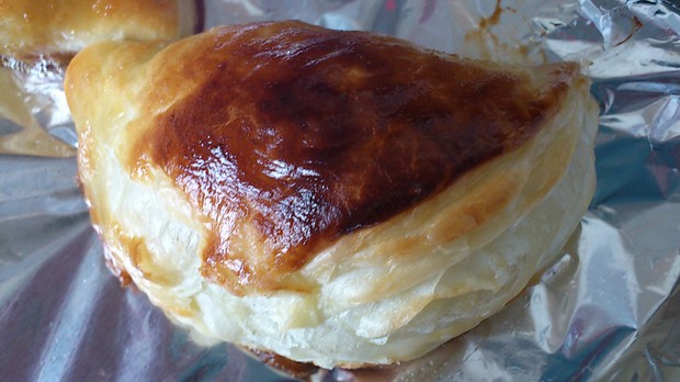 8、将所有酥角包好,表面刷一层全蛋液。然后静置25分钟。烤箱预热到上下火220℃,将静置好的酥角表面再刷一层全蛋液,放入烤箱中层,烤15分钟左右,至表面金黄色即可出炉。