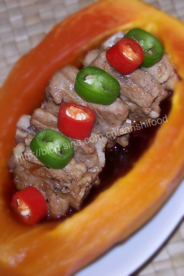 蒸这道菜的时候,木瓜下边一定搁一个盘子,由于木瓜上锅蒸后会变得很软,取出时很容易弄碎,搁上盘子好取也能保持木瓜的造型。