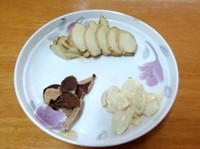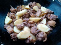 加入薯仔、姜、蒜、陈皮、生油继续爆炒一会,再加入盐、酱油、红糖、米酒、水适量。