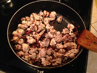 转大火,放入兔肉,加料酒,盐和糖快速翻炒