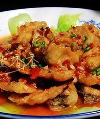 再次加热油温致8成热时,把炸干水份的鱼片倒进锅里大火迅速炸成金黄色捞出