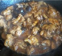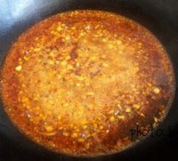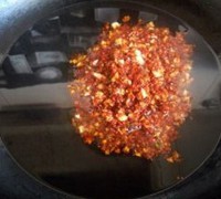 将鸡块的水份煸炒干后加入炸好的油辣子