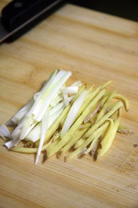 把老姜洗净切成丝,小葱洗净切小段,淀粉加水调成水淀粉备用