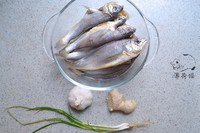黄鱼处理干净,沥干水分。姜切姜片,蒜去皮拍扁,葱切葱花。