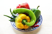 将彩椒、菜椒、尖椒洗净去蒂,切小块(2cm*2cm)。