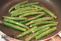 4. 炒锅内放油烧至七成热,下杭椒煎出虎皮。