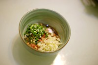 肉末加葱姜蒜末、料酒、重要的是蒸鱼豉油,一点点淀粉拌匀。