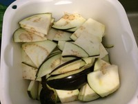 茄子切片备用,不用切太大,不太好熟,可以比这个略再小一些