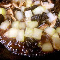 注意随时翻动一下冬瓜,不要干锅啦!当冬瓜变得有些透明的时候,把调料汁倒入锅里,翻炒一会儿后改大火收汁。