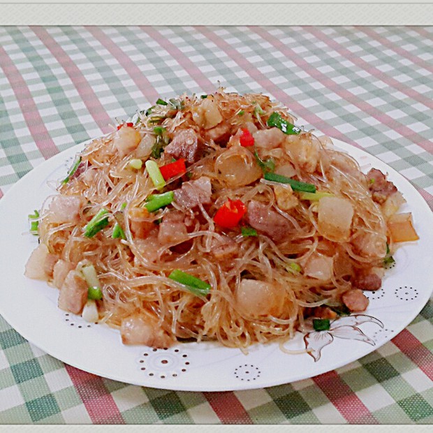 倒入粉丝,加入少量老抽、生抽、料酒、盐、糖,迅速翻炒,尽量少加或不加水。