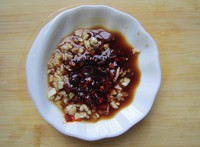 取一只小碗,加入蒜泥,生抽,陈醋,香油,油辣椒。(因为咸肉本身已经比较咸了,所以不加盐)