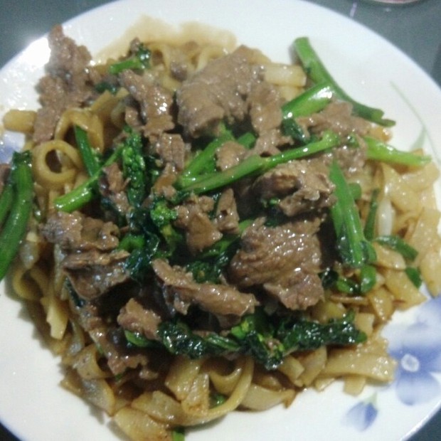 再起油锅,这次油锅要够热,因为要爆炒牛肉~同样的,加蒜粒爆香之后,把牛肉倒进锅里,快速翻炒,然后把芥兰也放进去,再加最重要的沙爹!再放点热水,拌匀淋到炒好的河粉上就搞定了!