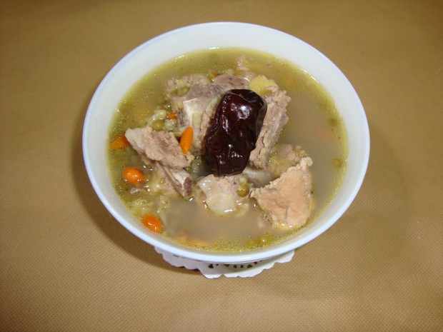 醋是必不可少的,它能让排骨中的钙质溶于汤中,让人体更好的吸收,还能让绿豆能迅速的煮开花,避免了绿豆煮不熟透的尴尬,但是用量一定要把握好,不可过头。绿豆清火,枸杞红枣补气补血,夏天喝这样的汤是再好不过的了~