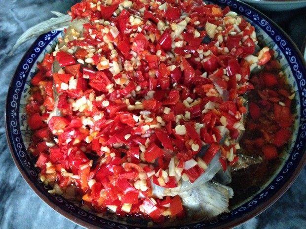 5. 再铺上制作好的剁椒,然后锅烧开水再把鱼头放进去蒸