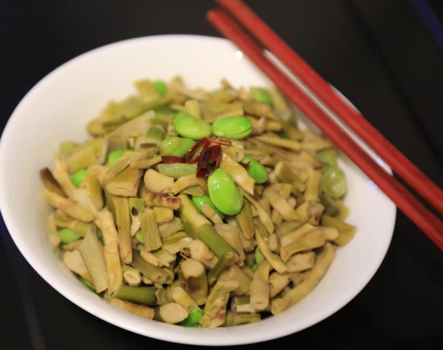 锅中少油,热了以后加笋干,稍微翻炒,加毛豆,加料酒三勺,盖盖子,小火,闷上一分半钟。