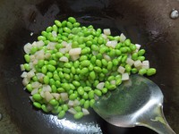 再入毛豆翻炒至表皮微皱。加一勺生抽和一勺糖调味,改中小火不断翻炒至上色
