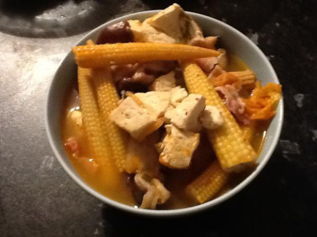 如果爱吃葱可以加一点。国内没有babycorn就用其他块状蔬菜代替,比如刀豆,西兰花,莴苣等等都可以。我这样做比较清淡不会太辣太咸(因为培根本身味道就比较咸),如果口重就加点韩国辣酱或者直接加辣椒盐也行。如果没有培根,可以用五花肉代替,但是一定要记得五花肉先焯水去血沫再切片炒,而且用五花肉的话汤里面一定要加盐。喜欢金针菇也可以加(TAT太贵了买不起)。淘米水可以换成鸡汤。总之我做菜的方针就是不要特意搞很神奇的材料,手边有什么做什么。
