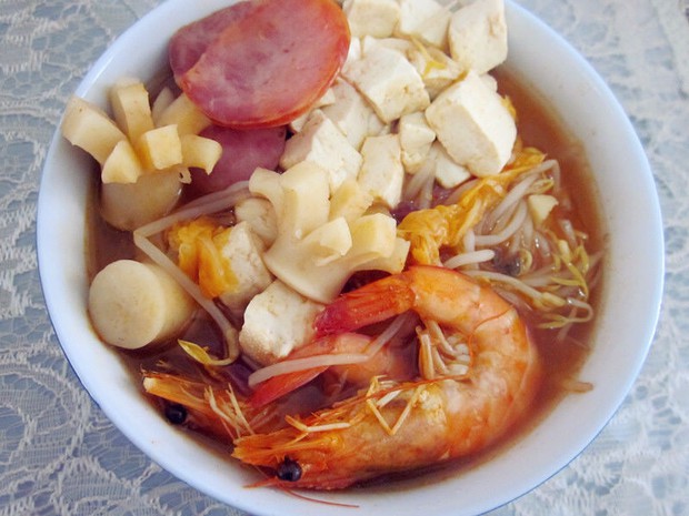 然后放进去豆芽、洋葱、香肠和豆腐,等到快开锅的时候在放虾,但是如果不介意虾的口感老的话可以刚开始和他们一起放进去