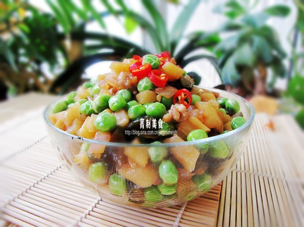 放入黄瓜咸菜丁和豌豆略炒,加白糖和水调匀中火翻炒3分钟,至锅内汤汁快收干时,放入剩下的一半洋葱翻炒半分钟,加鸡精炒匀即可