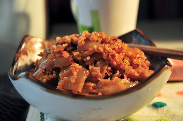 辣白菜已含盐,可以不必再放,尤其是单人版的。重口们可适当调入灯笼辣酱。。。烩饭本来是可以直接生米下锅的,但是由于对自己的信心不足,还是选择了预先处理再下锅,即便这样,还是略微糊了一点。电磁炉的火候什么的还真是不好控制。