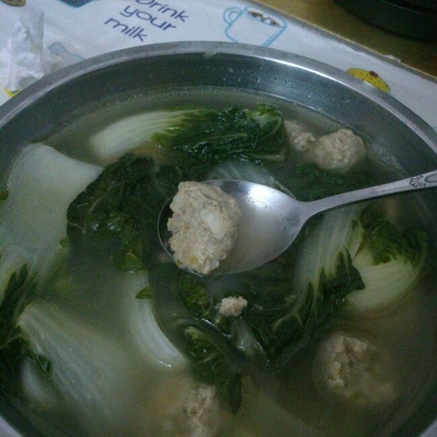 上完通宵的夜班,还跑了个公车,到现在还没缓过来……回来的时候在楼下菜市场顺手买了5棵可爱的小白菜,样子很跟小时候书上的白菜一个样啊~肉丸是昨天做一堆存起来的!