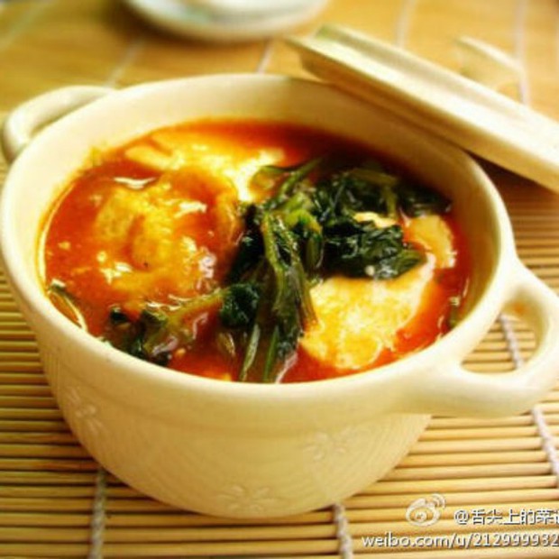 4. 加清水没过白菜表面,加入荷包蛋和豆腐,加入1勺辣酱,最后加盖至沸腾,沟入少许湿淀粉