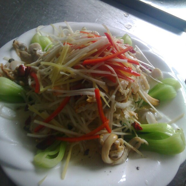 油菜摆边 掐菜垫底 放上三鲜料 葱姜丝 烧热油淋上 倒上蒸鱼豉油即可