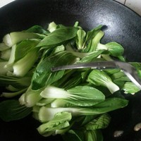 蒜末微黄,放油菜,油菜放进去打两个滚儿就可以了!